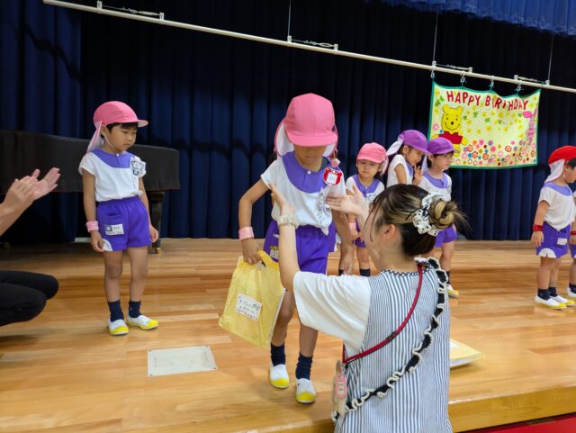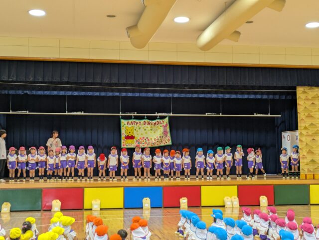 誕生児の人数を頭にタッチしながら数えると、しゃがんでかわすというお誕生会あるあるが見られます😁