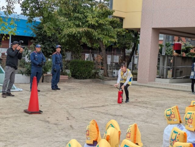 消防士さんに教えてもらった通りに消火器を持ち、先生たちも消火に挑戦です✨