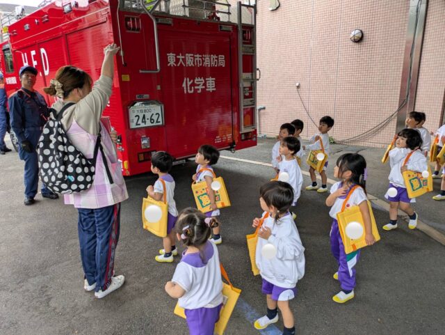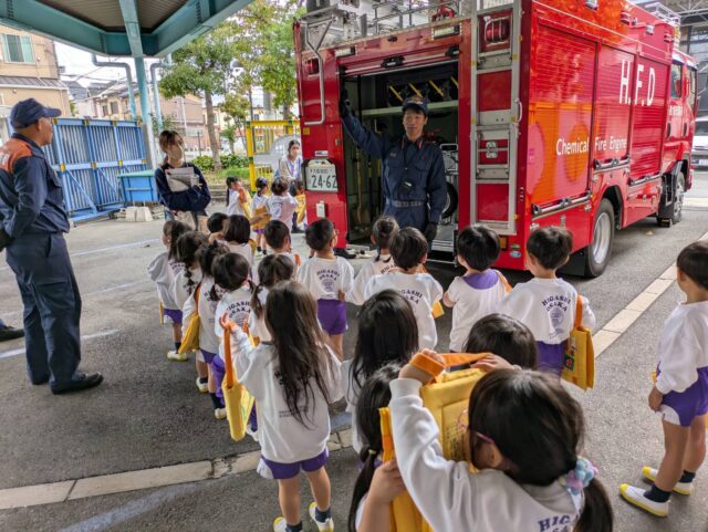 子どもたちは、興味津々で見学し、「このホースは何に使うんですか?」「重たいですか?」など消防士さんに沢山質問する姿が見られました!