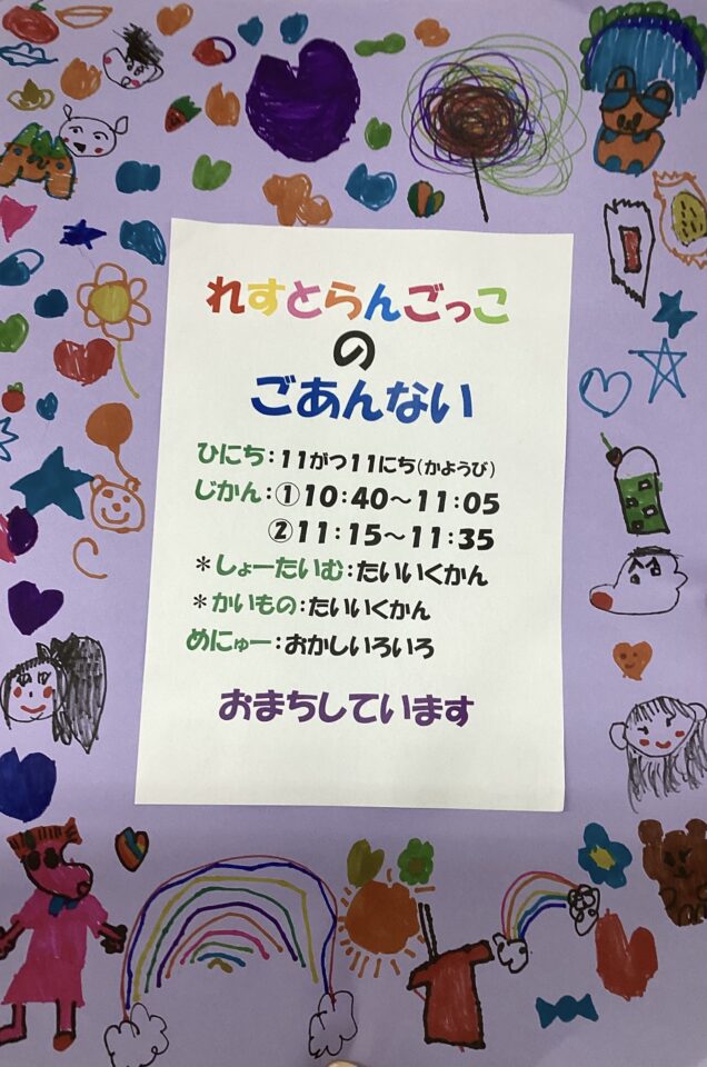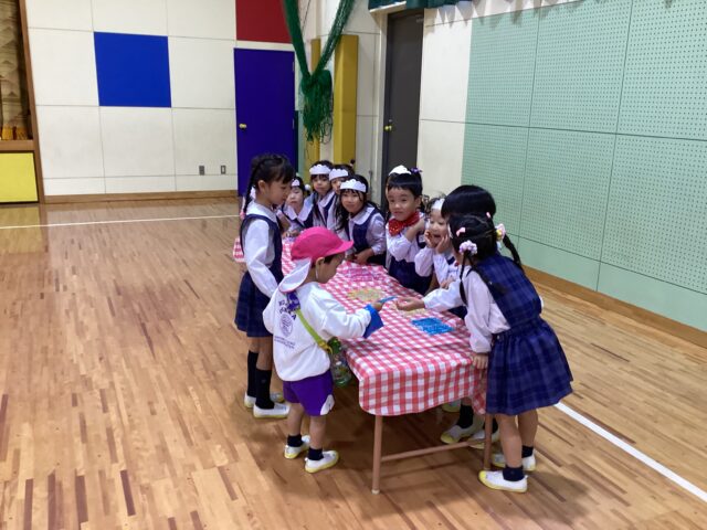 レストランごっこを通して、「自分で選んで買う」「相手を思いやりながら品物を売る」という経験や「年下の友だちを思いやる気持ち」「年長児に対して憧れの気持ち」などを育んでくれた事と思います☺️