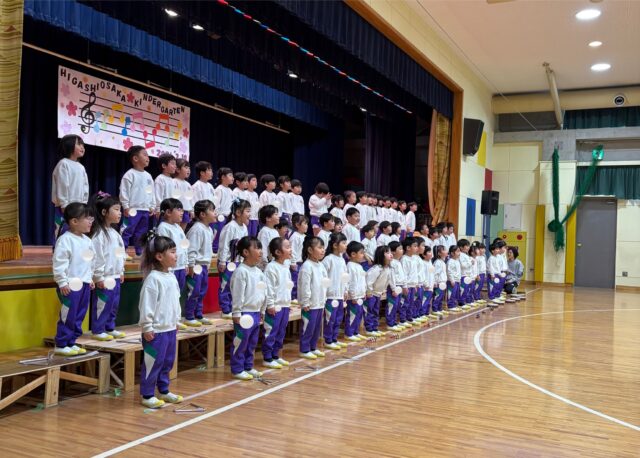 初めに3クラス一緒に『おおきくなるって』の体操をおうちの人に見てもらい、いよいよ合奏と歌の発表です🌟